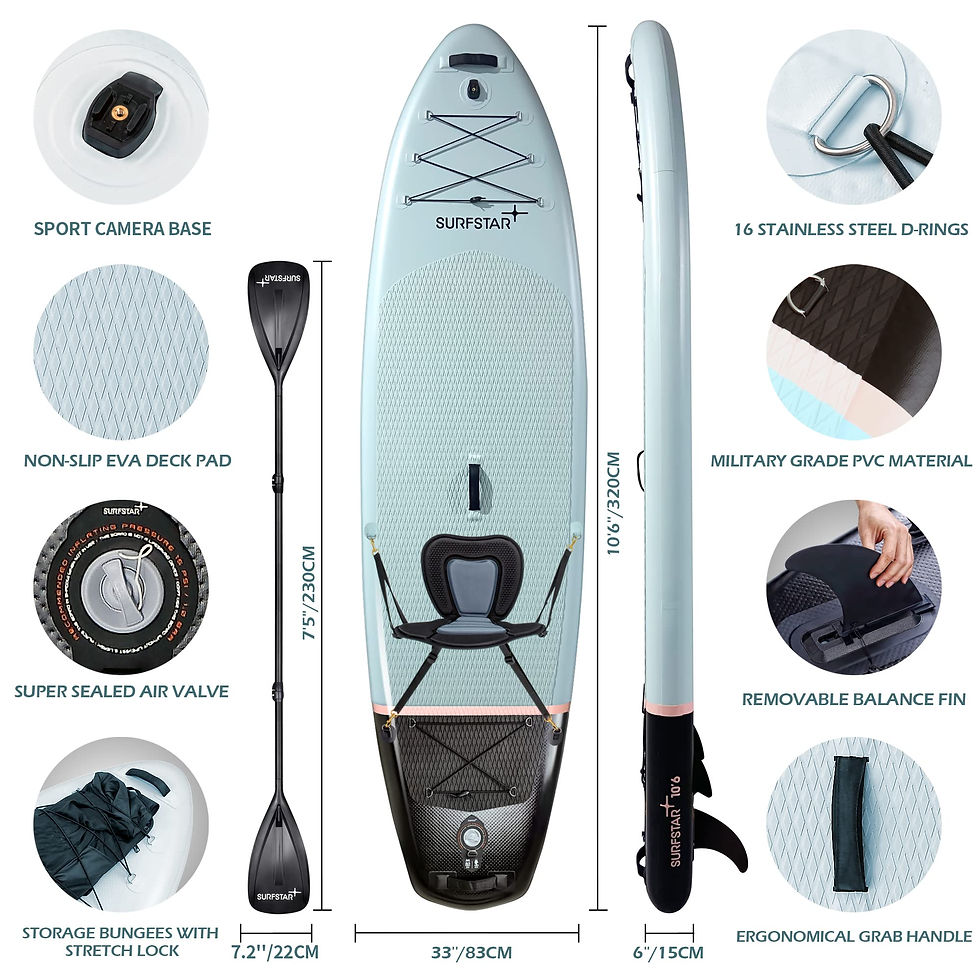 Surfstar Inflatable Paddle Board with Kayak Seat, 10'6"x33"x6" Stand