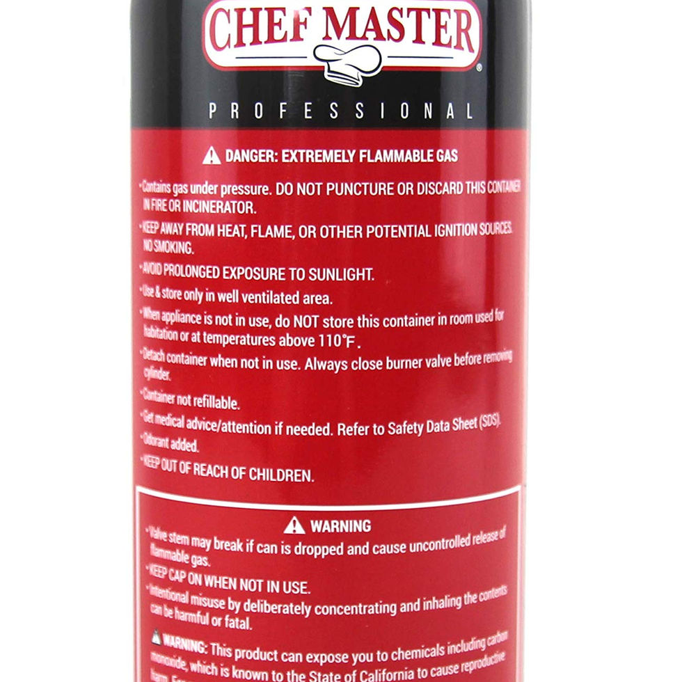 24 x 8 oz. BUTANE GAS FUEL CANISTER - This premium 24-pack of butane gas fuel canisters is designed for high-performance cooking and heating. Each 8 oz canister delivers a consistent, reliable flame, providing up to 2 hours of high-heat cooking or up to 4 hours on simmer. Perfect for camping stoves, portable gas stoves, butane torches, and culinary tools like crème brûlée torches, these canisters are essential for outdoor adventures, emergency preparedness, and professional kitchens. RELIABLE FUEL FOR CAMPING STOVES, TORCHES & OUTDOOR COOKING - Upgrade your outdoor cooking experience with this 24-pack of high-quality butane fuel canisters, designed for consistent performance in portable stoves, butane torches, and culinary tools. Specifically crafted for seamless compatibility with Chef Master butane stoves, these 8 oz canisters provide a steady, high-powered flame for camping, backpacking, catering, and emergency preparedness. Whether you're searing meats, caramelizing crème brûlée, or cooking meals. PRECISE ALIGNMENT FOR EFFORTLESS COOKING - Designed for precision and ease of use, these high-quality 8 oz butane canisters feature a notched collar for perfect alignment in camping stoves, portable gas stoves, and kitchen torches. This innovative design ensures a secure fit, optimizing fuel flow for consistent performance in cooking, grilling, and caramelizing crème brûlée. Whether you're camping, tailgating, or working in a professional kitchen. MULTI-PURPOSE BUTANE TIN FUEL CANISTER - Power your culinary tools and camping gear with these high-quality butane fuel canisters, designed for reliable performance in torch lighters, kitchen torches, and portable gas stoves. Ideal for caramelizing crème brûlée, searing meats, and cooking on the go, each 8 oz canister provides long-lasting fuel for multiple sessions. Perfect for camping, tailgating, food trucks, and emergency preparedness, these butane refills ensure you never run out of fuel when you need it most. PREMIUM QUALITY CAMPING STOVE FUEL - Experience unmatched reliability and top-tier performance with the Chef Master Premium Performance Camping Stove Fuel. Expertly engineered to meet the demands of outdoor cooking, this high-quality butane stove is your ultimate companion for camping, creme brulee preparation, and beyond. Whether you’re grilling, boiling, or using a kitchen torch, Chef Master ensures exceptional performance, making it the perfect choice for culinary adventures.