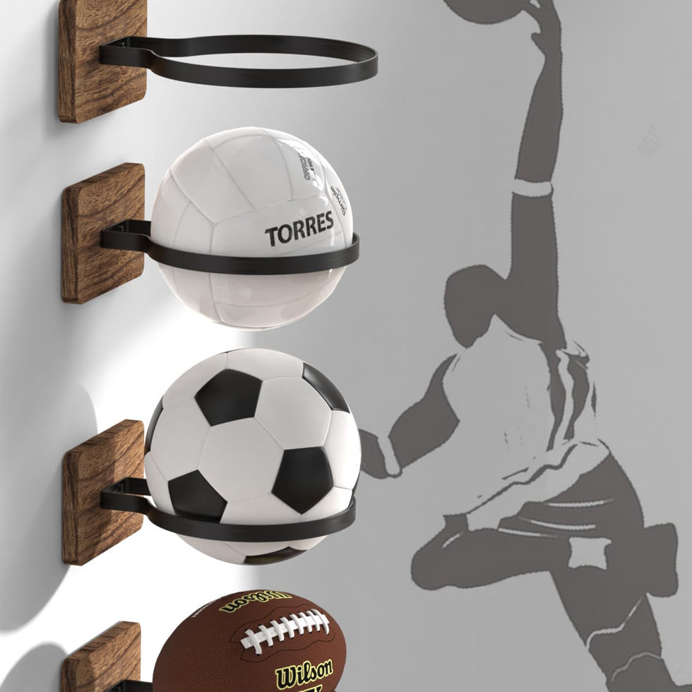 4 Pcs Wall Mount Basketball Holder with Wooden Base, Ball Storage