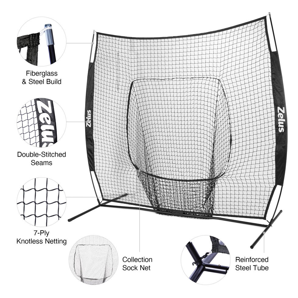PERSONAL COACH: Our 7'x7' baseball and softball practice net with starting accessory kit is the perfect training aid you need to improve your pitching, batting, and other fundamentals or for teaching the next generation of great players STURDY & STABLE: Our portable barrier net features 7 ply 1-3/4 inch knotless netting and double stitched seams to handle your hardest hits and throws, while the lightweight yet strong metal supports and ground stakes hold the frame firmly whatever the weather PORTABLE & DURABLE: Ready to go at a moment's notice, this versatile training kit for baseball or softball folds compactly into the included travel bag to work wherever the game takes you, from your backyard to the practice field; the fiberglass and coated steel frame provides years of corrosion-free performance HELPFUL ACCESSORIES: This comprehensive set includes everything you need to perfect your skills, including a net with a convenient center pocket that catches and holds the balls for quick retrieval, a 2'4" to 4' extendable batting tee, and a 16 oz. weighted baseball for hitting practice EASY SETUP: Your hitting and pitching net backstop from Zelus goes up in minutes thanks to the clear design, helpful instructions, and unique folding and unfolding design; start training right away and wake up each morning better and stronger than yesterday!