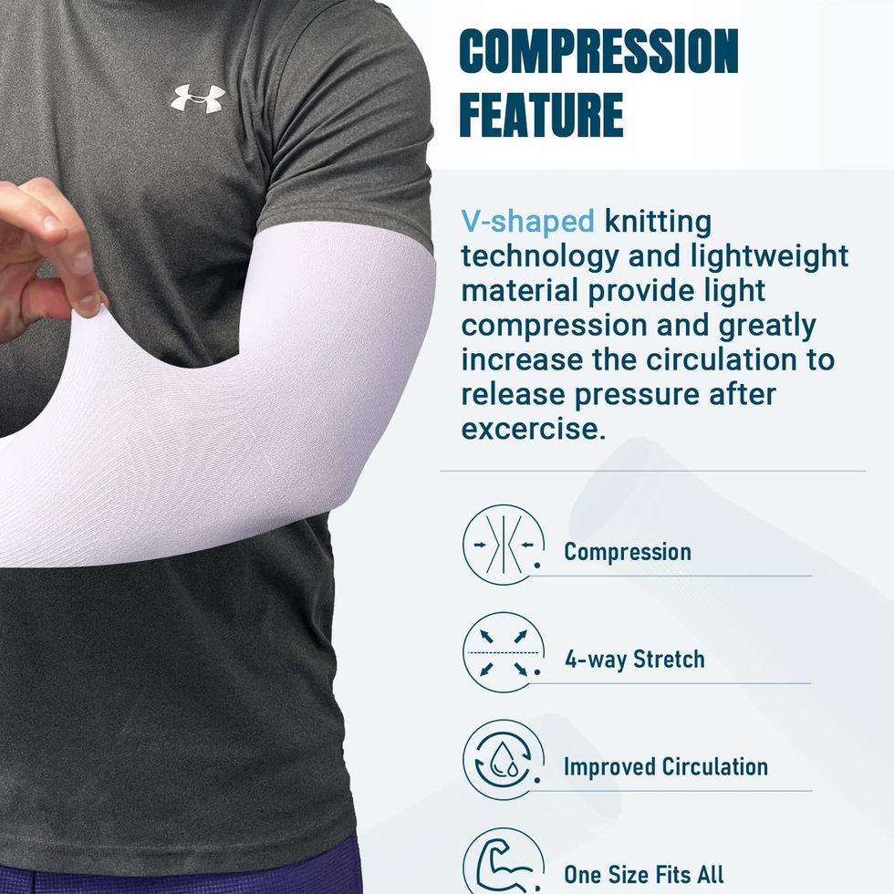All-Round Sun Protection - UPF 50+ protective technology works great to keep the harmful sun rays off your skin when golfing, shooting, running, bike riding, etc. No need for greasy sunscreen or long sleeves shirts. These uv sun protection arm sleeves shield your arms from sunburn and skin damage during long days in sun. Superb Cooling Effection - We made our arm sleeves of sweat-wicking materials, absorbing sweat and wicking moisture away. With a slight breeze or even just moving around a lot they do become cooler than bare skin, supper cooling and comfortable to enjoy a round of golf or basketball. Breathable and Comfortable Fabric - Premium breathable fabric with seamless sewing technique snugs lightly on your arms like a second set of skin, soft and lightweight. V-shaped knitting technology on lower arms provides light compression and greatly increases the circulation to release pressure during exercise. One Size Fits All - With 4-way stretchy feature, the length can be stretched to 35 inches and the upper arm can be stretched to 7 inches, flexible to any size. Super easy to slip on and off. High elasticity keeps sleeves from slipping down all the time and hugs your arms firmly without being too tight. Full Tattoo Coverage - Black color does work to full tattoo coverage. There is no any visible logo or brand outside this cooling arm sleeves. Wash machine/hand wash & hang to dry to keep sleeves in new-like condition. Comes with 2 pairs for any outdoor activities or work on construction and gardening.