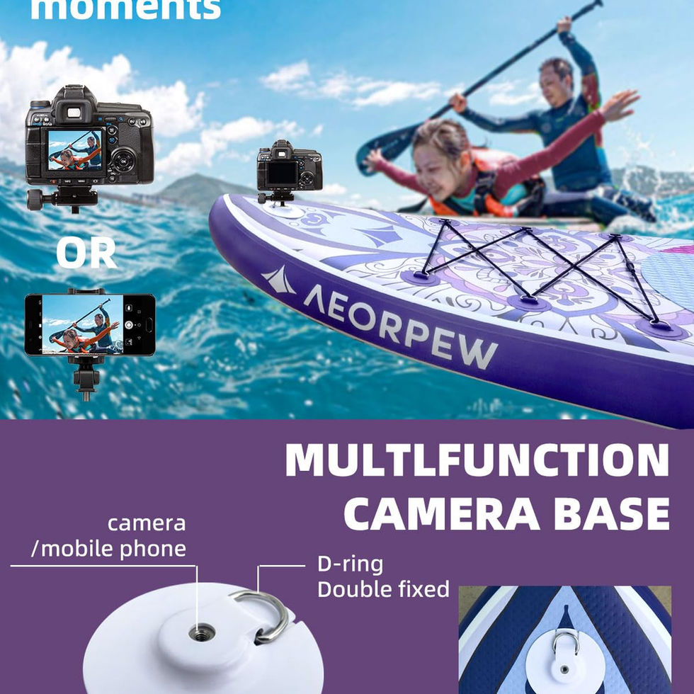 WOMEN PADDLE BOARD - AEORPEW Inflatable paddle board is specially designed for female SUP board beginners and enthusiasts who love water sports. It is suitable for water yoga, fishing, sunbathing, and enjoying the magic and charm of nature. BALANCED DESIGN, WIDE DECK - The paddle boards size is 11' x 34'' x 6''. 34in width provides unparalleled stability. Women and beginners can easily control it. The partition design of the EVA anti-slip pad allows you to experience the fun of paddling more accurately whether sitting or standing. LIGHTWEIGHT, PORTABLE, MULTIFUNCTIONAL - The inflatable stand up paddle board weighs 19.8lb and comes with a paddleboard backpack, so you can easily carry it anywhere. The top of the paddleboards is equipped with a camera bracket, where you can install a sports camera to record beautiful moments. COMES WITH ALL SUP ACCESSORIES - Everything you need for paddle boarding, large capacity backpack, hand pump, 4-piece adjustable paddle, removable fins, leash, waterproof dry bag, etc. the hand pump, please remove the white protective cover before use. At the same time, 6+4 D-ring storage ropes are set at the top and tail, making it easy to carry your water sports equipment! AEORPEW COMPREHENSIVE GUARANTEE - Aeorpew provides full protection for its inflatable paddle boards, including a 30-day return policy and 1-year warranty. If you encounter any problems when using the inflatable paddleboard, please feel free to contact Aeorpew.