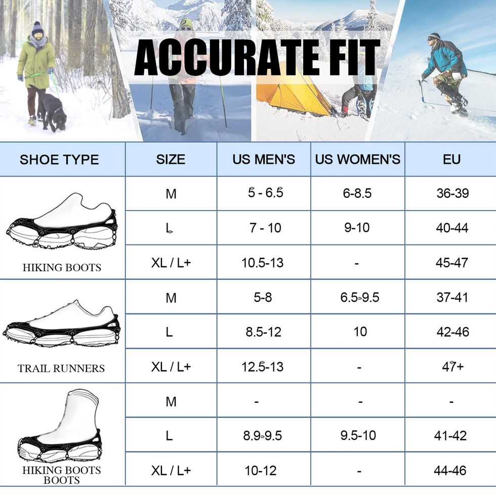 【Widely Used and Unisex】 Ice Cleats for Shoes and Boots Suitable for male and female of any age including teenagers,adult,elders. Crampons Ice Cleats Suitable for various kinds of sports,hiking shoes,boots,mountaineering boots. Crampons great for Winter hiking,Climbing, trail running and ice fishing. Ice Cleats used on angled terrain,ice roads,icy driveway,mud and wet grass,dangerous sections of trail,etc. 【Exceptional Traction More Safe】Our crampons for boots have 19 steel spikes with welded, double chains on each ice cleat for superior traction. These cleats easily penetrate thick layers of ice and snow, providing outstanding stability and grip to keep you steady and safe on various terrains. Strategic placement of spikes ensures equal distribution of weight for long-lasting comfort and durability. 【Easy to Wear and Carry】Crampons for hiking boots easy to put on & off with adjustable strap, they fit easily and securely over your shoes or boots. Flexible and pocket size crampons portable and lightweight,can be put into the carry bag included and will not take up much space. Note:The "L" mark on crampons means size "Large", not meaning "Left". There is no Left or Right difference for crampons products. 【Long Lasting Even Under -45°C 】Cover of snow cleats is made by Silicone,not the general TPR rubber,highly elastic,flexibility, anti-abrasion as well as anti-tearing and won't easy to tear or snap. Ensure long lasting comfort and durability Till strong performance even under -45°C. Ice spikes for shoes equipped with heat-treated stainless steel spikes would not rust and would more firm and durable. 【All-Weather Protection】Whether you're traversing icy slopes, frozen lakes, or slippery trails, these hiking spikes offer all-weather slip resistance to help you explore the beauty of the outdoors.Say goodbye to slipping or losing balance and embrace the enchanting winter landscapes. Crampons Ice Cleats can be reused for years.