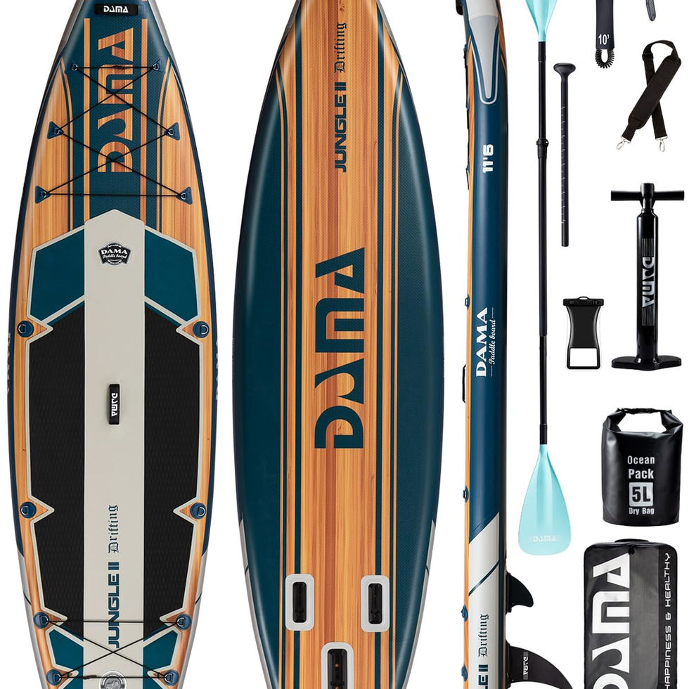【EXCLUSIVELY DESIGNED FOR RACING】This surfboard is designed for the competition, the front of the board has a special pointed design, has greatly improved the speed, this is the special difference from other boards; it also design wider at stern for ensures stability. This design can maintain stability and safety while increasing speed, you can experience the pleasure of brave the wind and waves, barge you to the forefront in the competition! 【FULL ACCESSORIES】 It comes with everything you need to start paddling : the 11' blow up paddle board, 4-piece length adjustable floating paddle, hand pump which has air pressure gauge, safety ankle leash, repair kit(NOTED: glue not included), removable fin, 5L waterproof bag for essentials such as keys and food, transparent waterproof cell phone bag, a large comfortable backpack to hold everything. 【EXTRA STEEL D RINGS EXTRA FUN】 10 minutes to inflate and 5 minutes to deflate, this inflatable paddle board is very convenient to set up. In addition to the grip handle, the unique extra steel D rings on the paddle board bring extra convenience to carry. You can also use these rings to connect your stand up board with your friend's, and enjoy the traveling together. 【MILITARY PVC & FLOATING PADDLE】 DAMA inflatable stand up paddle board is made of Military Ultra Light PVC Drop Stitch Fabric. That creates a stiff, rigid and sturdy stand up sup board which is durable for years. The premium anti-slip soft deck ensures safety and enhances grip. Our 4-piece collapsible aluminum paddle is floating 【CUSTOMER AS GOD SERVICE】 This DAMA inflatable paddle board is an all-around multifunctional board, with a weight capacity of 350 lbs, it is suitable for Yoga, Fishing, Surfing or carrying kids and pets together in both fresh and salt water. As a manufacturer, we stand by the quality of our SUP paddle boards and treat every customer as god, and we are glad to provide a 1-year manufacturer's warranty at no additional cost.