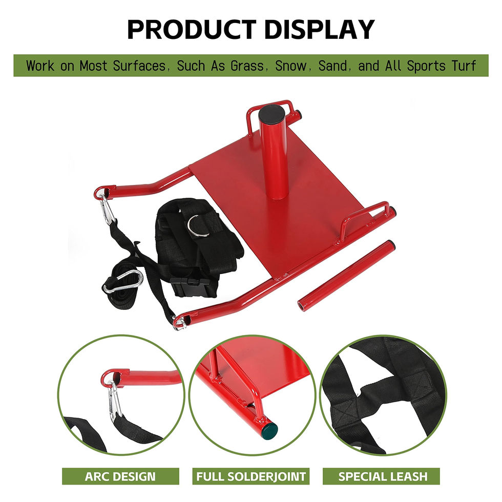 Premium Materials: The fitness sled is made of automotive grade heavy duty steel, strong and durable, not easily damaged. The red powder coating provides excellent grip, enhances your training and keeps your sled looking new long after use Dimension: 20"x15" x10" overall size. Leash length: 10 ft. Item Weight: 9 Pounds. Max capacity: 100 Lbs Excellent Load-bearing Performance: Our weight sled is suitable FOR APPROXIMATELY 12 inches in diameter of the Olympic plates, of course, can be smaller. You can overlay the Olympic plates as needed, as long as it is under 8 inches, it can bear Adjustable Resistance: Customize your training intensity by adding or removing weight plates to the workout sled, providing you with the flexibility to challenge yourself and progress at your own pace Versatile Training Tool: Excellent for adding speed training to your workout whether it be for aerobics, football, soccer, tennis, etc. The power sled adjustable shoulder harness for maximum security during workouts. Training Sled designed to be used on most surfaces. Grass, Snow, Sand, and all sports turf. Also available for gym, plastic track