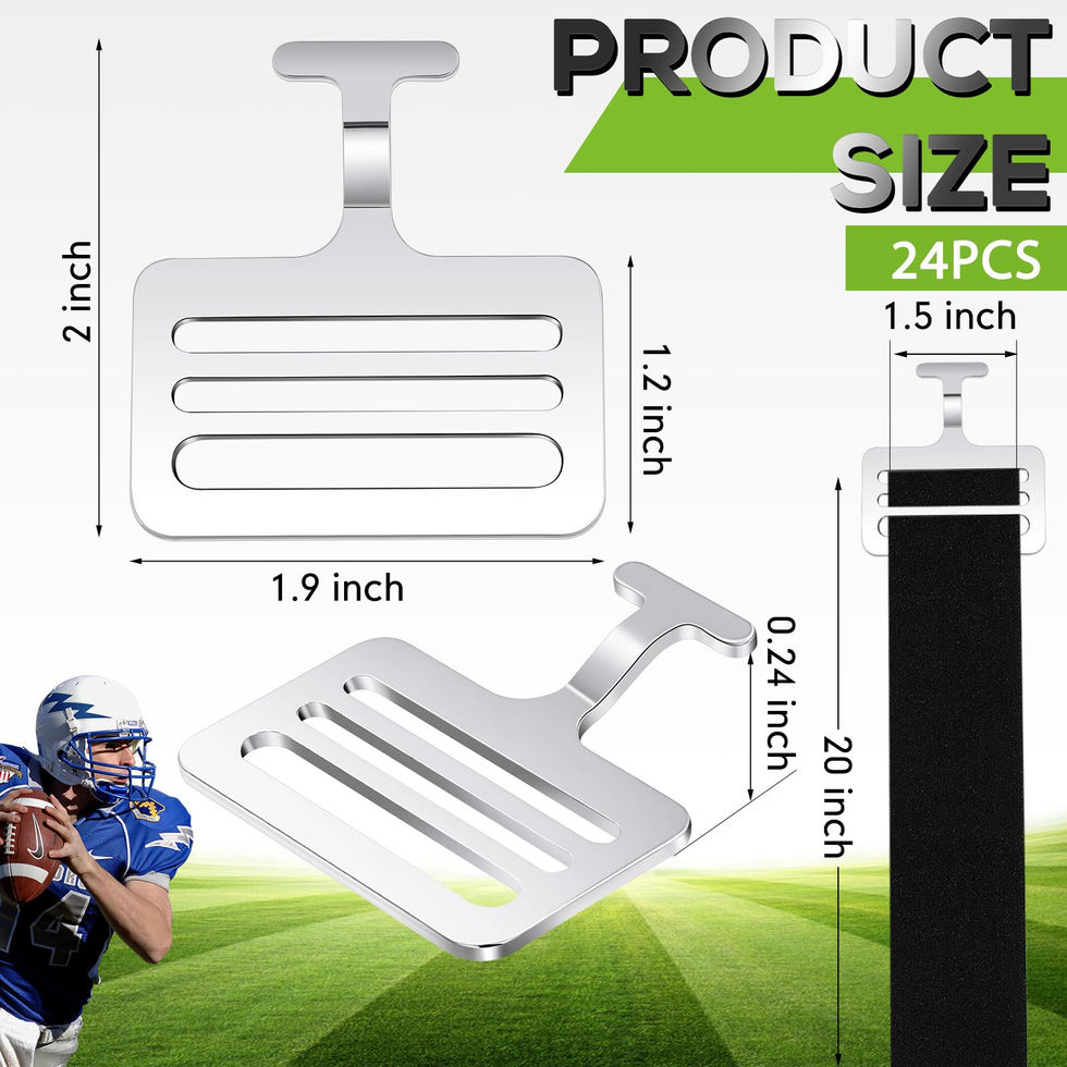 Notable Size Information: the football shoulder pad T hook is about 1.85 x 1.2 x 0.24 inch (L x W x H), and the hole diameter is about 1.5 inches, one size fits most shoulder pads; And the football shoulder pad strap measures approx. 1.5 x 20 inches, long enough to meet your various needs Reliable and Serviceable to Use: made of quality steel material, with double sided electroplating process, the shoulder pad T hook is stable in structure, not easy to deform, rust or corrode, hard to bend and break; Besides, the elastic strap is made of polyester cotton, durable and quality, serving you for a long period Easy to Install: the football pad T hooks and football shoulder pad straps are easy to install on the football shoulder pad without other tools, saving your time and energy Practical Sports Accessories: these shoulder pad straps with T hooks can fix your football shoulder pad in place, neither affect your competition nor bring you uncomfortable wearing experience Nice Combination to Meet Your Needs: the package comes with 12 pieces of shoulder pad T hook in silver color and 12 pieces of elastic straps, sufficient in quantity to meet your daily exercise needs and replacement demands