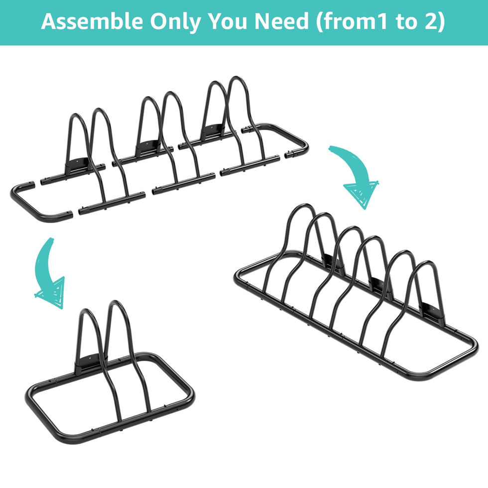 Compatibility with Various Bikes: Maximum tire width of 2.5". Compatible with mountain bike, road bike, kids bike and scooter Secure for Disc Brakes: Thoughtful rack shape protects the disc brake. The derailleur and spokes are safe too when you park the bike with the rear tire Adjustable for Garage: Overall size 82.5" L x 14.8" W. Holds up to 6 bikes, and you can assemble only the racks you need (from 1 to 6) Easy for Outdoor: Weather resistant and easy to assemble with just a screwdriver. Take it to outdoor camping or trailer for bikes without kickstands Stable for Multiple Bikes: Quality metal and front plate prevent the upholder from becoming wider. Keeps multiple bikes standing straight up even in the wind