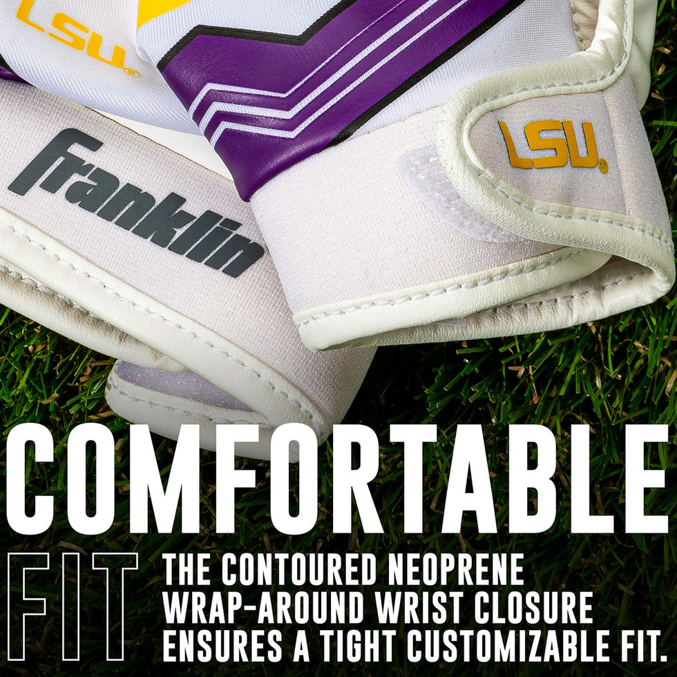 LSU TIGERS GLOVES: These gloves are have authentic team logos and colors so you can support your favorite team with authority CATCH EVERY FOOTBALL: The one-piece tacky silicone palm with extended thumb and forefinger coverage make these gloves super sticky to make snatching footballs out of the air a breeze COMFORTABLE FIT: The contoured neoprene wrap-around wrist closure ensures a tight customizable fit to your hands for maximum comfort and performance BREATHABLE: The lightweight polyester backhand is designed to be flexible and breathable for full range of motion and comfortable dry hands PERFECT FOR GAME DAY: Wear at a tailgate, in the backyard, or as part of a costume!