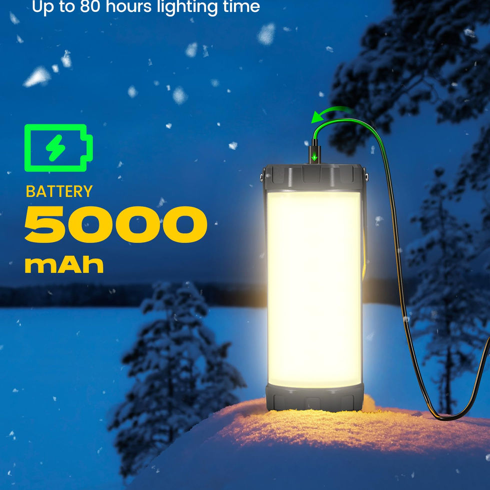 [Survival Level Design] This camping lantern was designed for extreme weather & tough environments: 1. The IP68 waterproof level makes it work under 1.5-meter water; 2. It was proven to be durable in repeated military-level drop tests from 40-inch; 3. It offers exceptional visibility in thick fogs with anti-fog mode, ensuring clear visibility in adverse weather; 4. The SOS mode can be attention-grabbing when in danger. Perfect emergency light for power outage and tough outdoor activities. [Ultra Bright 1200LM & 5 Brightness Levels] With 106 evenly distributed LEDs covering the entire camping lantern body in 360 degrees, it illuminates your surroundings with exceptional brightness and uniformity, eliminating any shadows for clearer views. 5 brightness dimmable for your various lighting needs. In emergencies, the "ultra bright" mode emits 1200LM for 3-min to cover a wider area. Essential lanterns for the darkest & stormiest nights. [3 Light Modes & SOS Mode] We design this lantern with 4 light modes to suit your needs, including 3000K, 4000K,6000K & SOS mode. Specifically, the 3000K is mainly for lighting in the thick fog; the 4000K is for walking or hiking; the 6000K is for repairing or illuminating a broader area like a tent or campsite. Additionally, the SOS mode can be attention-grabbing when in danger. Customize your camping light to better suit your surroundings. [Rechargeable & Long Lasting] The camping light is rechargeable, means no more battery waste. The modern USB-C port is not only faster and safer, but allows to be charged from small solar or typical plug-in portable power banks when away from your car or home. The built-in 5000mAh battery can last 80 hrs runtime for your heavy use, making it powerful enough for a solid weekend camping trip or for power outages caused by hurricanes & storms - a powerful lantern for all your lighting needs. [Small Size & Lightweight] This lantern is a mighty powerhouse, yet it is small in size and lightweight. At a mere 2.2 x 2.2 x 5.6 inches, it is even more compact than a 330ml soda can. Weighing in at a mere 8.5 ounces, the lantern is lighter than a 250ml bottle of water. Its diminutive size makes it an ideal addition to your hiking backpack, especially when every inch and every ounce counts. Don't hesitate to get this small yet powerful LED lantern for emergencies.