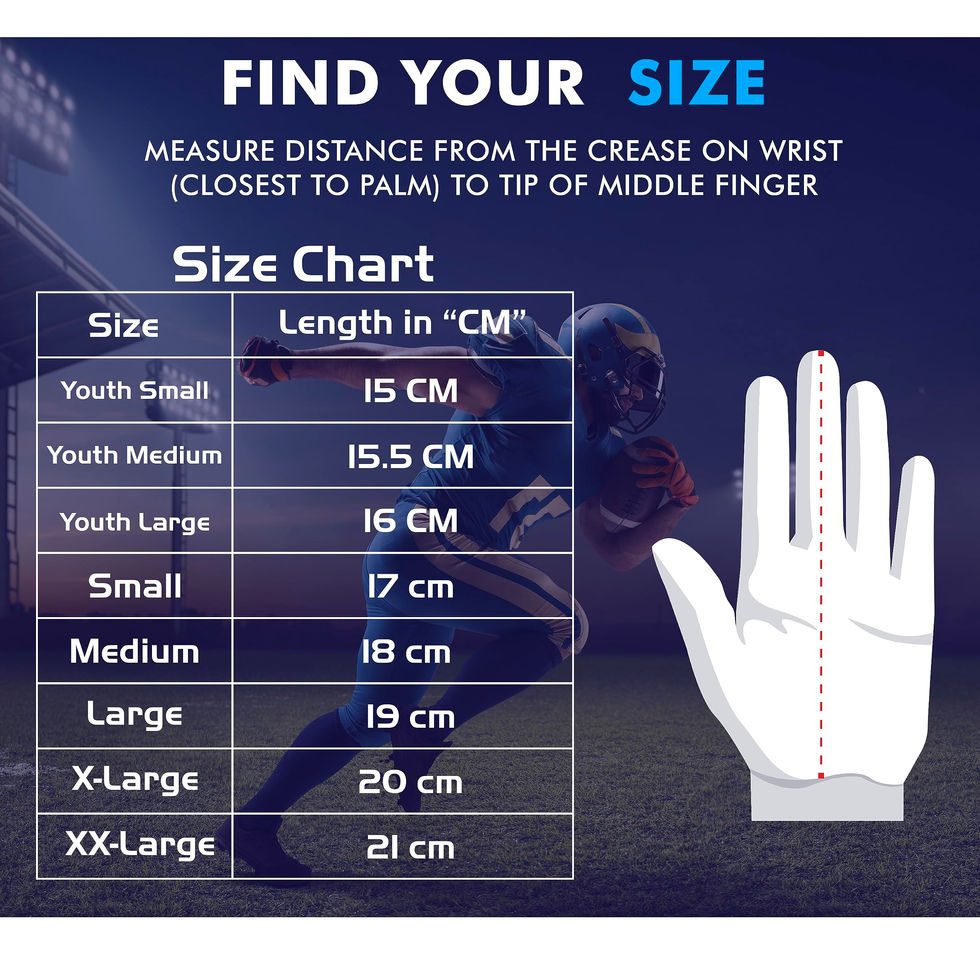 ๐๐๐ฅ๐ญ๐ข๐ฆ๐๐ญ๐ ๐๐ซ๐ข๐ฉ ๐๐๐๐ก๐ง๐จ๐ฅ๐จ๐ ๐ฒ: Tired of dropping passes due to slippery conditions? Our youth football gloves feature state-of-the-art tacky silicone over the entire palm for an unparalleled grip on the ball, enhancing your control and precision during the game.With our receiver gloves, experience a superior grip, even in challenging weather, ensuring you stay at the top of your game. ๐๐๐ซ๐๐๐ข๐ฌ๐ข๐จ๐ง ๐ ๐ข๐ญ ๐๐จ๐ซ ๐๐ฉ๐ญ๐ข๐ฆ๐๐ฅ ๐๐จ๐ฆ๐๐จ๐ซ๐ญ: Sick of gloves that either feel too tight or too loose? Our american football gloves designed with a precision fit and advanced velcro closure system and comfortable neoprene cuffs for wrist profection, these gloves for football offer a snug and comfortable feel, allowing for maximum dexterity and flexibility. ๐๐๐ฎ๐ซ๐๐๐ฅ๐ ๐๐จ๐ง๐ฌ๐ญ๐ซ๐ฎ๐๐ญ๐ข๐จ๐ง ๐๐จ๐ซ ๐๐จ๐ง๐ ๐๐ฏ๐ข๐ญ๐ฒ: Tired of gloves that wear out quickly? Built with flexible & stretchy spandex back and soft sweat-wicking liner keep hands dry and cool , these men's football gloves have Advanced stitching at all stress points for durability, providing long-lasting performance and withstanding the rigors of intense gameplay. ๐๐๐ซ๐๐๐ญ๐ก๐๐๐ฅ๐ ๐๐๐ฌ๐ข๐ ๐ง ๐๐จ๐ซ ๐๐ฅ๐ฅ-๐๐๐๐ญ๐ก๐๐ซ ๐๐ฅ๐๐ฒ: Sweaty and uncomfortable hands ruining your game? Our football youth gloves incorporate advanced ventilation technology and breathable materials, keeping your hands cool and comfortable in any weather conditions. ๐๐ ๐ข๐ง๐ ๐๐ซ ๐๐ซ๐จ๐ญ๐๐๐ญ๐ข๐จ๐ง ๐๐จ๐ซ ๐๐ง๐ฃ๐ฎ๐ซ๐ฒ ๐๐ซ๐๐ฏ๐๐ง๐ญ๐ข๐จ๐ง: Worried about finger injuries during play? Engineered with built-in finger protection technology, these american football gloves reduce the risk of hyperextension, providing an extra layer of safety for your hands.