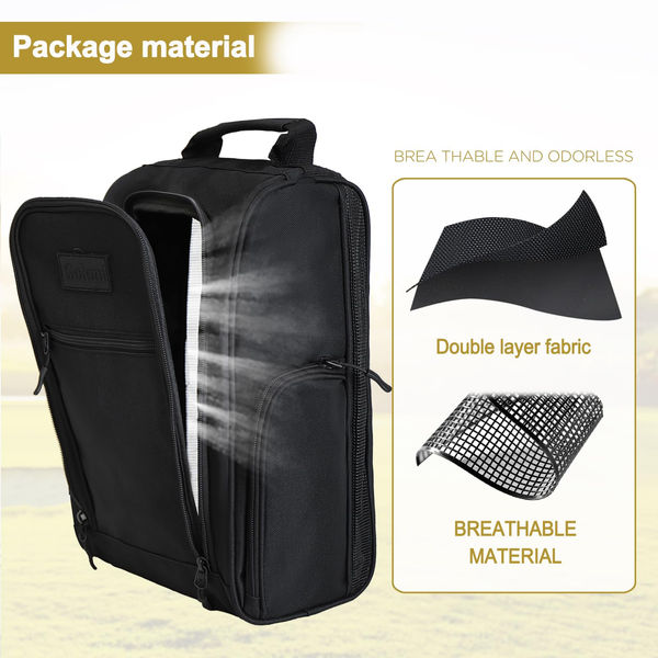 Perfect Golf Shoe Bag:The larger horseshoe-shaped opening design is convenient for storing shoes and taking them out.Convenient side pockets can be used to store tees, golf balls, socks, etc Ventilation Design:Shoe bags built with side ventilation to air out the contents, offering excellent air flow to prevent odors from being trapped, giving your shoes room to breath and the smell to dissipate Suitable for carrying shoes on any occasion:Shoe bag size:9.4inch(L)*6inch(W)*14inch(H),fits up to shoes size 14(US )for men/15(US)for women. Designed with golf in mind, but also works perfectly for any athletic shoes - baseball, basketball, soccer cleats - or use it to carry and travel with your shoes for work - dress shoes, heels, etc Convenient to carry : The portable handle design of Golf Shoe Bag can help you hang your shoes on the golf cart, clip them onto your golf bag, or hang them anywhere you want Durable and easy to clean :Made of high-quality and durable polyester Oxford fabric, it is not easy to tear and is easy to clean. This golf shoe bag is designed to withstand dust and dirt, protecting your shoes regardless of weather conditions