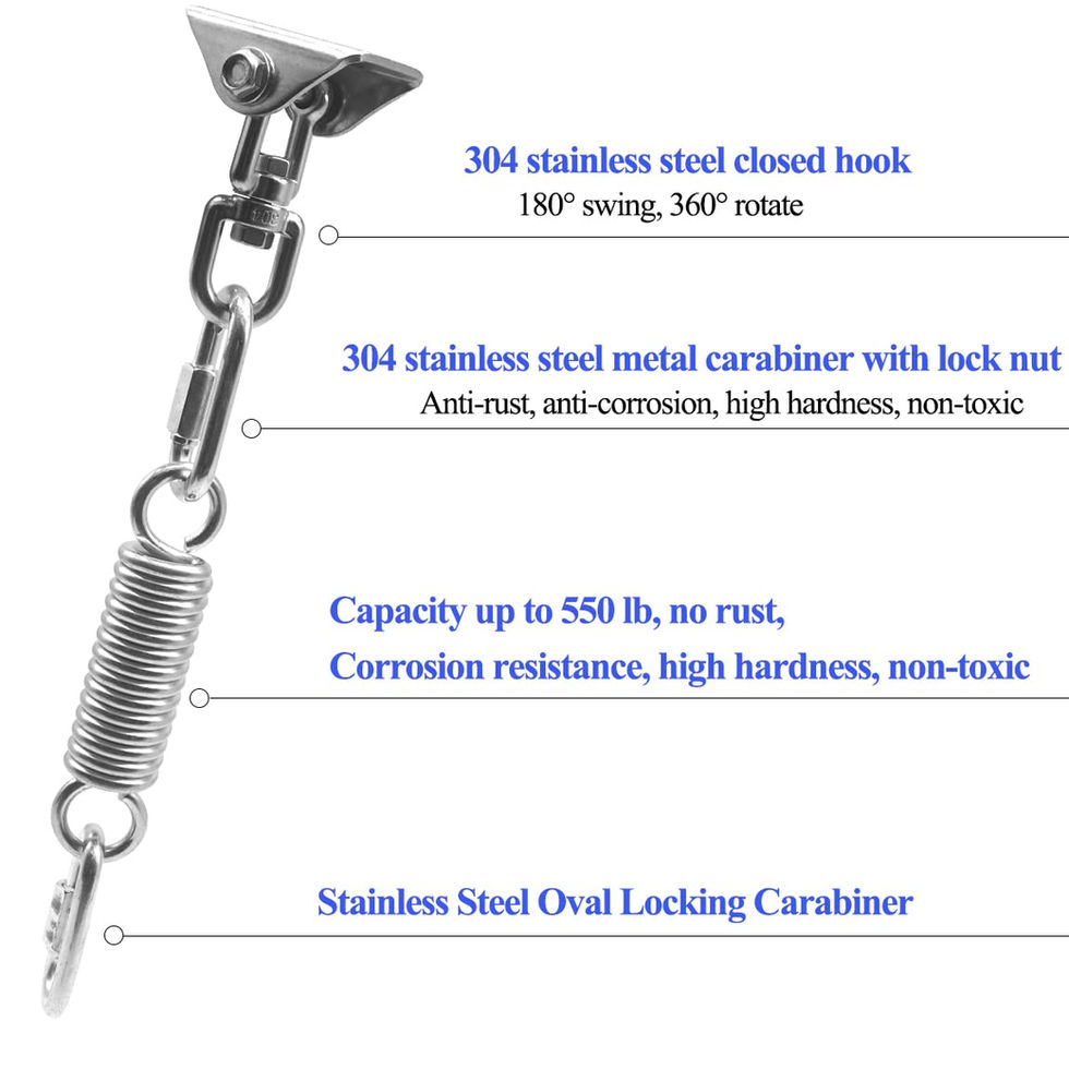 【Premium Material】Hammock hanging kit is made of high quality 304 stainless steel, load capacity 1000LB, No rust, corrosion resistance, high hardness, non-toxic and pollution-free environment. The thick material ensures their durability and safety, perfect for outdoor and indoor application. 【Easy to Install】Swing hanger with two pre-drilled holes for bolting installation to wooden beams, cedar wood, rafters and/or concrete. 2 concrete anchor which fit concrete application and 2 hex lag bolts which fit wood application. A unique one-piece design and can be installed in minutes. 【Pure relaxation】The swing springs are SUPER HEAVY DUTY, will absorb the shock and preserve the longevity, Reduce noise, vibration and stress, not stretch out. The spring locates between the overhead support and swing chain to provide a more comfortable, softer feel to porch swings, free-standing swings, hammocks and hammock chairs. 【180°+ 360°Rotate】The hammock hanging kit rotating hook can be rotated all-around without any tangles or distortion, so you can swing your hammock freely to relax or have fun. It prevents tangles or twists. Innovative design ensures wider and more flexible use. Perfect for Hammock Chairs or Ceiling Mount Porch Swings, Yoga, porch swing, hammock, sandbag, hanging chair, lamp, sling trainer, awning, sling trainer, chair, backyard and more. 【What you get】1 x Stainless Steel Hammock Hanging Kit, 1 x Swing Spring, 2 x Snap Hooks, 2 x Screws for concrete and 2 x Screws for wood; Amazon official warehouse and distribution, safe and fast, if you have any questions during use, please send an email at any time, we will help you solve the problem in the first time.