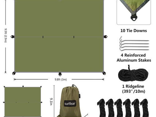 COMPLETE HAMMOCK TENT TARP kit with everything you need for fast, easy assembly. All lightweight so you can pack this wherever your adventure takes you. The durable waterproof 210D Oxford is PU 3000 giving you professional protection from driving rain and big fat spring snows. Relax and rejuvenate with confidence. With this tarp you're covered! 32 FOOT LONG RIDGELINE gives you all the extra support you need for the most intense weather. This can hold lots of snow or pouring rain without slacking or falling. Gives your waterproof tarp lots of structure and strength for exceptional reliability 6 GUY LINES with 10 ties that can be pitched in multiple configurations. Can be used as a rain fly for hammock, tent tarp to prevent the wear and tear of your tent against the ground. Let you successfully camp on everything from a sandy beach to mountain slope. It's just right for a picnic, sun canopy, and much more 4 STRONG ALUMINUM TENT STAKES keep you securely grounded. This also includes a stuff sack for the tarp and a separate stuff sack for accessories. It all fits easily in a backpack to take on weekend getaways or full week of camping and fishing. You will be surprised how light this is for such a sturdy, durable, professional grade shelter BEST GIFTS: Many people are preparing by purchasing several to equip the entire family. This product is backed by a long-lasting quality guarantee for materials and craftsmanship. HURRY AND BUY NOW while we have this popular camping/hiking accessory in plentiful supply. It makes a wonderful birthday gift, holiday present, or anniversary surprise for the outdoor enthusiast in your life