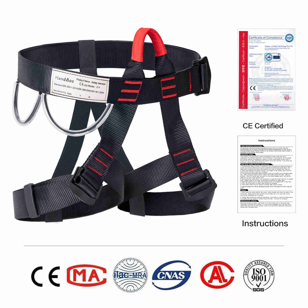Simple but Safe Harness—This safety harness looks simple. Made of premium polyester material. It featured with high tensile strength, a low friction coefficient, and lightweight. This makes the harness durable and strong. Comfortable Structure— With the traditional buckles, the harness construction distributes pressure, and the waist belt and leg loops are lined with breathable mesh to ensure comfort. comfortable cushioning ensures safety during rock climbing. Safety Certified: Up to 300KG Weight limited. Breaking strength: 25KN. Waist 20" to 45"; Leg 18" to 30". Min waist adjust to 15", min leg to 10", one size suitable for all ages, kids and adults, can be shared by the whole family. CE Certified, but not certified for indoor climbing. Safety Belt for Climbing: 2 equipment hooks on the side of harness belt which are very durable and convenient for hang chalk bag or other climbing gear and never impede climbing. The buckles allow quick and easy adjust the waist and leg belt. Widely Use: Great for use in construction, demolition, climbing, welding, roofing, camping, emergency, zipline, fire rescue and other working on the higher level. With nice-looking unisex design, it fits women and men, even children in school. If you use it for gym climbing, please consult the gym before purchasing.