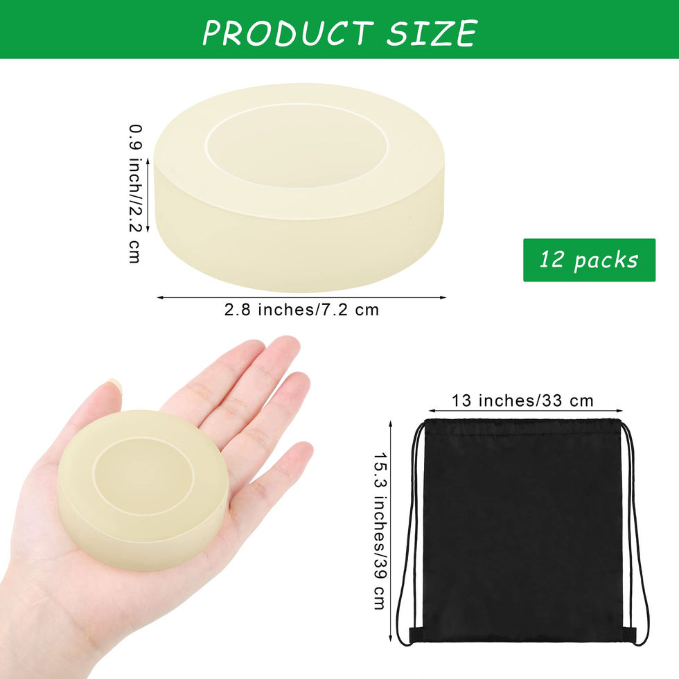 Package content: you will receive 12 packs of hockey pucks and 1 pack of black drawstrong bag, and these hockey pucks glow green in the dark, giving you a more original training or entertainment experience, allowing you to immerse yourself in the full fun of sports with your friends Premium material: these hockey pucks are made of high quality PVC material, sturdy and durable, safe and reliable, lightweight and excellent, not easy to break or crack, can be used for a long time Easy to use: put in the outdoor strong light source absorb light for an hour, the hockey pucks can glow for about 8 hours, and they can be used for 10 years under normal use, (there is no prolonged outdoor exposure), and enough quantity can well meet your daily needs for playing, changing, and sharing with others Proper size: the diameter of each hockey puck is about 2.8 inches/7.2 cm, and the height measures about 0.9 inch//2.2 cm, reasonable in size, can be easily paly with friends and store in the drawstring bag Extensive uses: these hockey pucks have a wide range of applications, and they are ideal for a variety of venues such as outdoor training grounds, hockey clubs, residences, backyards, etc.; besides, the hockey pucks are ideal for youth, teens and adults in outdoor sports