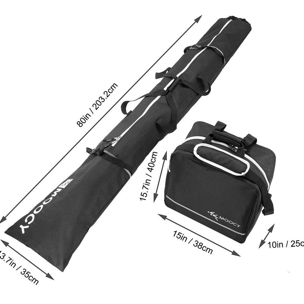 Carry Your Gear with Ease:This ski travel bag can fit skis up to 200cm. The ski boots bag can accommodate ski boots up to size 13. A perfect ski and boot bag combo set for both mens and womens skiing gear.Enjoy super easy travels with boots and ski bag.Comfortably fit cross country, downhill, boots, helmet, snow gear and accessories Utilizes Innovative Roll Top Technology:Our adjustable length Unpadded ski bag fits most ski up to 80 inch. With special top rolling up design,allowing you to adjust the length of the large cross country ski bag from approximately 170cm (rolled) up to 200cm (unrolled),and has a unique reflective strip design Compact Design & User-Friendly:The ski boot and helmet bag can fit most boots up to size US 13, while allowing additional room for a helmet, jacket, or goggles. The ski boot bags for adults include an adjustable, padded shoulder strap, side mesh tote pockets for storage of additional gear Includes adjustable shoulder carry strap with shoulder pad, side mesh pocket and reinforced handles Exceptional Durability Material:The ski bag and boot bag combo crafted with premium water-resistant polyester,Waterproof material is durable and not easily deform and crack.Reinforced construction with double stitching, waterproof liner, burly carry handles ADD-ONS:The cross country ski bag adjustable clips to tighten your gear and prevent moving around. Name card slot so your bag is easily found and identified. Added two exterior compression straps on the ski sleeve to handle your skis and ski equipment tightly and securely during transportation