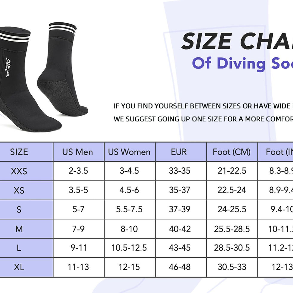 Multiple Use: Take your water and beach activities to the next level with these essential neoprene socks. Perfect for swimming, diving, paddle boarding, kiteboarding, and kayaking, as well as beach soccer and volleyball, they deliver the comfort and support you demand for peak performance. Don’t settle for less—choose these socks for your best experience yet! Sandproof for Beach Adventures: Discover the OMYAFL neoprene socks, the perfect companion for your beach activities. These socks are expertly designed to keep sand and tiny particles at bay, ensuring a hassle-free experience. With their innovative glued and blind-stitched seams, they provide a snug fit that shuts out any sand, allowing you to fully enjoy your time on the beach without any irritation. Stay Warm During Water Sports: The OMYAFL water socks are designed using unique sewing technology and made from 2mm neoprene material, which effectively protects against the cold. These socks significantly reduce water seepage, keeping your feet warm during all your water sports activities. Anti-slip Design: The water socks feature advanced silicone traction that grips slippery surfaces like boat decks, swimming pools, and shores. Safeguard your adventures and focus on enjoying your trip without the fear of slipping! 3mm Neoprene Socks: Designed for outstanding flexibility and durability, these socks offer superior protection against sharp rocks and debris, keeping your feet stay safe and comfortable. Their sturdy construction prevents holes from forming in the toe and sole areas, making them a reliable choice for all your adventures.