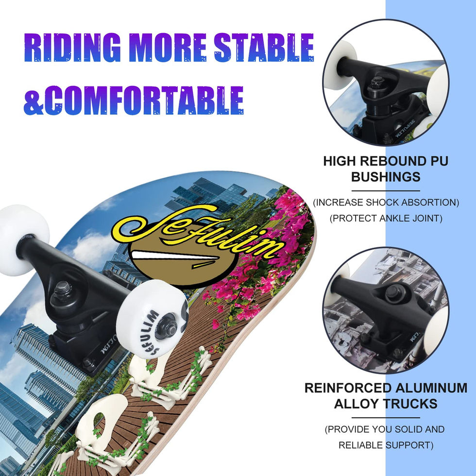 Professional Street Design Pattern ------ Each Sefulim Skateboard Has its Own Unique Design That Covers the Whole Bottom of Skateboard High Quality Products ------ The Sefulim Skateboard comes fully assembled with 7 ply maple wooden deck with colored bushings, tough wheels, ultra smooth bearings, all aluminum metal trucks, and shock pads Professional Built for Max Tricks ------ The Sefulim Skateboard Consists of 7 ply maple deck which is able to withstand heavy twist and sudden impacts. Maximum load is up to 220lbs Gift Worthy ------ This Sefulim Skateboard Always A Good Idea Around Birthdays for your boy or girl, Holidays and Other Special Occasions. What You Get ------ 1 x Sefulim Skateboard; 1 x Wrench Tool for Skateboard; Professional Customer Service.