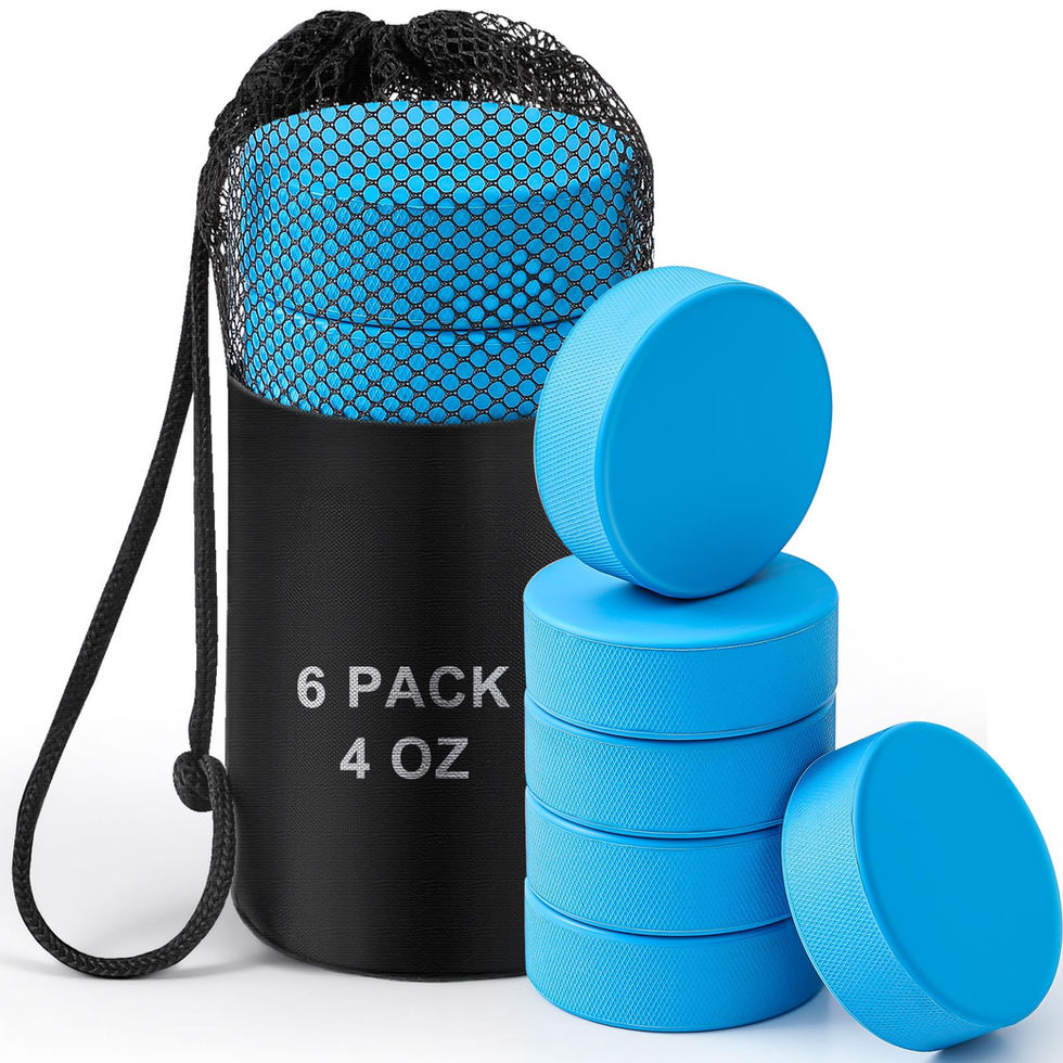 Practical Training Kit: the package includes 6 pieces of 4 oz lightweight hockey pucks, ensuring that you're ready for multiple rounds of training; The pucks are innovatively designed to meet the rigorous demands of many hockey training sessions; What's more, the set comes with 1 mesh carrying bag which ensures easy carrying and organization A New Standard for Hockey Training: our lightweight pucks are in the official size of about 3 x 1 inches/ 7.5 x 2.5 cm, aligning with the stipulated size for competitive play; This is particularly advantageous for players who wish to simulate tournaments conditions in their training sessions; Consequently, you have access to genuine training experience regularly Enhanced Training Experience: these ice hockey pucks weighing 4 oz each are designed to revolutionize the way you train; They imitate the dynamics of authentic ice hockey pucks while adding value of endurance training; The added weight is crucial in helping you build control and power, tweaking your game performance to new heights. They provide a game realistic experience, ensuring each training session is as productive as possible Power Up your Game: our blue hockey pucks cater to most skill levels; It doesn't matter if you're a beginner trying to learn the ropes or a professional trying to sharpen your tactics. The potential for improvement these pucks offer is immense, making them ideal tools to upgrade your hockey game experience A Thoughtful Gift for Teammates: these bulk hockey pucks are more than just training tools; They also serve as practical gifts that can help boost your teammates' performance; You can gift them to team fellows, underlining your mutual goal of improving performance and winning collectively