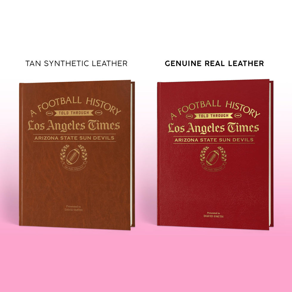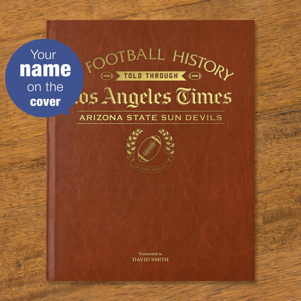Presenting the perfect gift for Arizona Sun Devils fans... A football history newspaper book that promises to take you on an unforgettable journey through Arizona State University football. Fork ‘em devils! Give the gift of memories with this stunning oversize centerpiece mirroring a tabloid newspaper. Revisit Sun Devil Stadium and beyond in our carefully curated collection of newspaper headlines, pictures, and articles. We've used our archive of 2 million+ newspapers to build a picture of the Sun Devils as reported by LA Times writers who witnessed each match. Track a fantastic history of notorious victories, and legendary players including Jake Plummer and Ben Sankey. The careful putting together of this book will immerse you in the spine-tingling energy of each game, and lead you on a nostalgic ride through decades of football. With articles beginning in 1969, watch them live on with coverage right up to the 2023/24 season! Celebrate with your favorite players in this newspaper birthday book- an ideal present for any fan or Arizona alumni! We have 25 top college football teams in the NCAA available, as well as other sports, music and historical interest titles; check out our store to view the full range. Bound in a A3 sized leatherette hardcover, and gold foil embossed with recipient's name FOR FREE, 12.5 x 15 inches of premium content.
