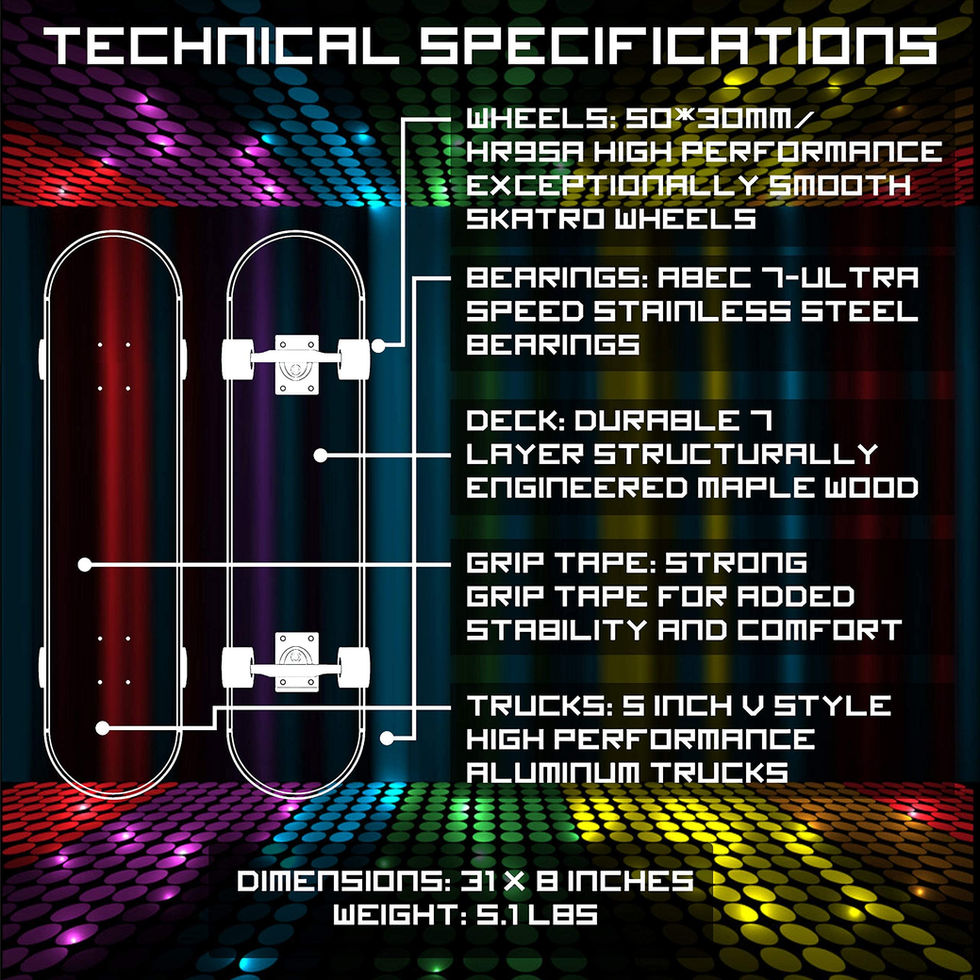 PERFORMANCE - 31" length x 8" width. 50mm x30mm 95A High Performance wheels, ABEC 7- Ultra speed stainless steel bearings, 5 inch durable and lightweight aluminum trucks SKATRO Adhesive technology - A proprietary adhesive technology that not only moulds all 7 wooden layers together, but also acts as structural reinforcement. This thin layer of structural reinforcement makes skatro boards comparable to 8 layer boards in strength, while still having the flex and agility seen in 7 layer boards. This technology is exclusive to Skatro AMAZING VALUE - Skatro outperforms many of the premium leading brands and sells for a fraction of the cost. Includes a FREE t-tool. This is a $10 Value. PERFECT SIZE - Optimal wood board size is perfect for cruising, tricks, olllie, kickflips. Better than a longboard or mini cruiser board. COMPLETE SKATEBOARD - 7 layer Maple Wood Skateboard is perfect for everyone: skateboards for kids, skateboards for girls, skateboards for beginners, boys skateboard