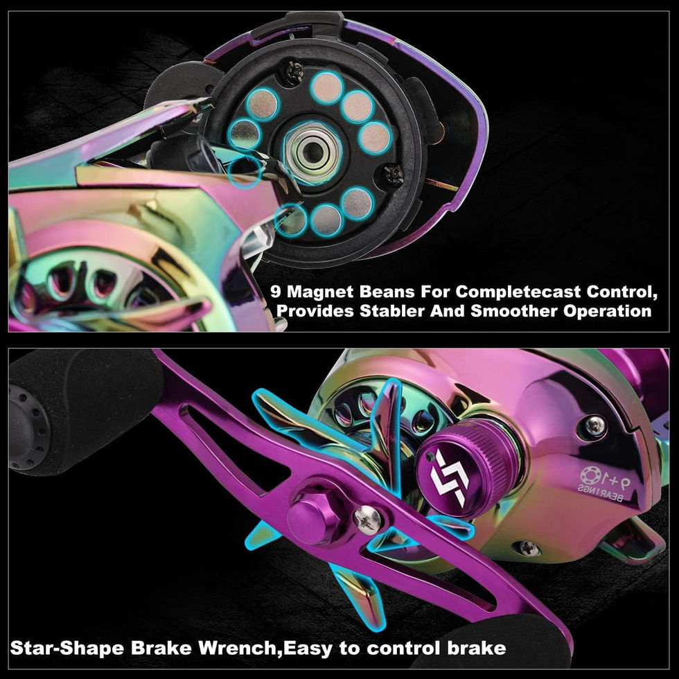 Featherweight and Durable: Made from high-quality carbon material, this fishing rod is incredibly sturdy yet incredibly lightweight, making it perfect for long hours of fishing without fatigue. Unique Water Transfer Printing: Stand out on the water with the eye-catching water transfer printing design that is both novel and stylish, making your fishing experience even more enjoyable. Comfortable and Anti-Slip: The high-density integrated EVA handle provides a comfortable and non-slip grip, ensuring a secure hold and maximum control during casting and reeling in. Smooth Casting with Stainless Steel and Ceramic Guides: The stainless steel and ceramic guides along the fishing rod minimize friction, preventing damage to the fishing line and ensuring smooth and efficient casting every time. Amazing Baitcasting Reel: Delivers a smooth fishing experience with a 6.5:1 gear ratio, simple magnetic braking system, equipped with 9+1 ball bearings and rear drag functions, offers durability and strength. Excellent Performance: The new Sougayilang Baitcasting Reel Combo is designed for exceptional value and performance. The spool is machined from aluminum alloy, which not only reduces weight, but also allows for accurate long casting Portable: This rod and reel combo is so good looking and powerful that you can take it anywhere you want to fish for a wide range of species, including bass, mahi-mahi, trout, and popular inshore species such as redfish