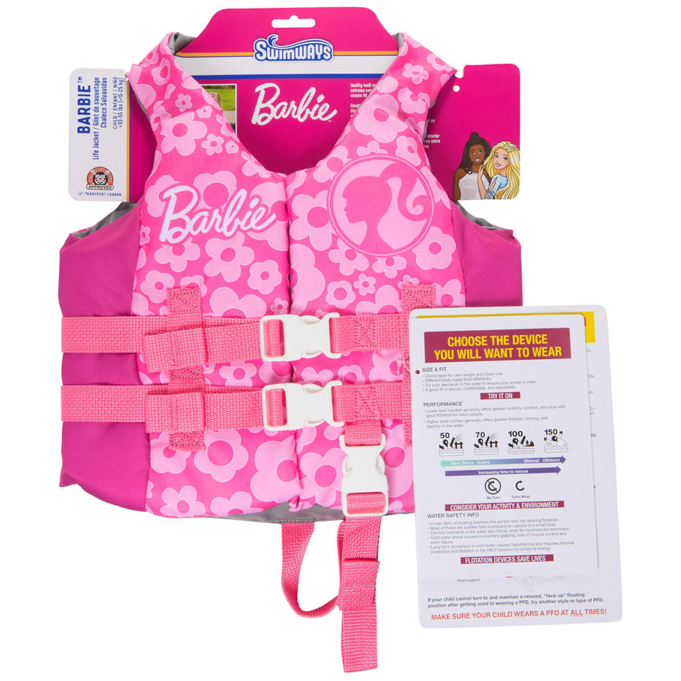 BARBIE THEME: Dive in for a day of fun at the swimming pool and learn to swim with Barbie and friends This kids pool float features your child's favorite fashion doll icon Barbie CHILD-SAFE DESIGN: Two waist straps and a leg strap ensure a comfy and snug fit, so you and your child can feel comfortable and secure while splashing at the pool, lake, or beach COMFORTABLE & EASY TO CLEAN: The quality twill outer cover on this children’s swim vest makes it easy to keep clean, and the soft fabric provides extreme comfort, so your little one can enjoy the water all day long SAFETY YOU CAN TRUST: This life jacket is Transport Canada & U.S. Coast Guard Approved as a swim vest for kids 30-50 lbs. Always keep children under direct supervision when in water KIDS POOL TOYS: Barbie doll toys, lake floats, kid pool toys and kids floaties are perfect for a day of fun in the sun Barbie toys are also great for summer pool parties & pool party favors