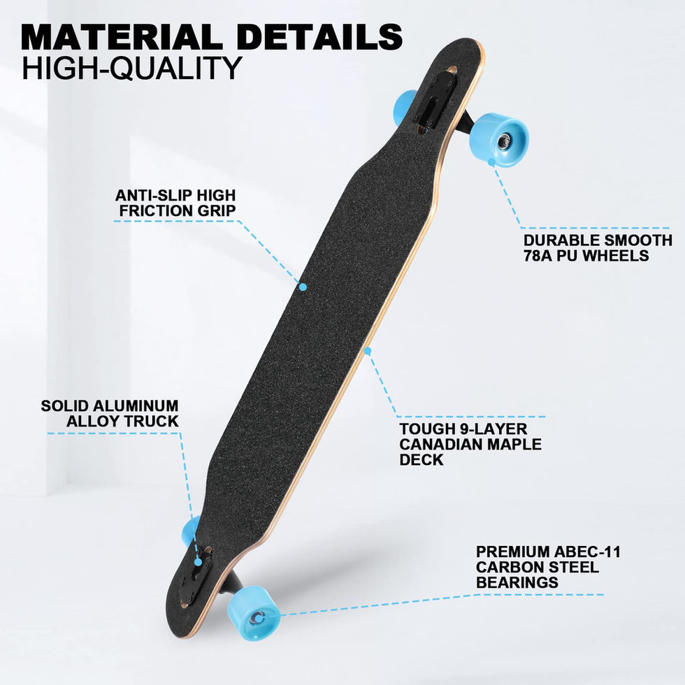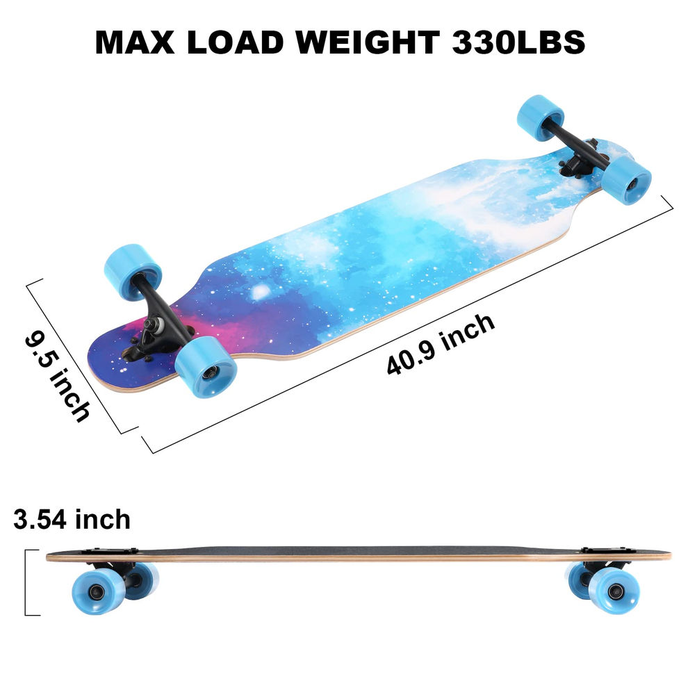 [TOUGH MAPLE DECK] 41 inch long x 9.5 inch wide deck made of cold press 9-ply natural maple. This is a great long board for teenagers girls, adults, teens and kids. The 9-layer of high-quality maple wood give the board a significant amount of strength without compromising flex. No assembly required. [DURABLE SMOOTH WHEELS] Durable 70mm X 51mm 78A soft-medium PU wheels for quick acceleration and a controlled and smooth cruise. ABEC-11 high speed carbon steel bearings make your ride precise and stable, enjoy an unsurpassed smooth ride. STUDRY ALUMINUM TRUCKS: Highly responsive 7-inch aluminum alloy trucks and ultra-high elastic PU support pad provide control and stability. [VERSATILE BOARD] Designed by passionate longboarders and designers. No assembly required, each long skateboard comes assembled and ready to ride. Longboard skateboard equipped with an all-in-one t-tool, adjust truck stiffness to your riding style in seconds. [FLEXIBLE MANEUVERABILITY] long bored skate bored built for downhill, speed and freestyle riding and dancing, suitable for all age sports enthusiast groups. Developing your strength, balance and reaction while enjoying fun.