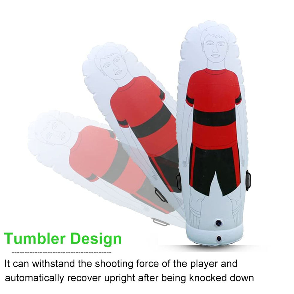 Exquisite Workmanship: The football inflatable dummy is made of high quality PVC material, which feels thick and durable. With a streamlined design, the stitching is meticulous, does not hurt your hands. Thickened bottom design, stable and durable, anti-leakage. Inflatable Tumbler Design: The top of the soccer inflatable dummy is a large-diameter inflatable hole and the bottom is a counterweight hole, which can be filled with water or sand. It can automatically return to an upright state after being knocked down like a tumbler. Three-dimensional Image: Sunshine characters are drawn with bright colors, which are not easy to fade, and have a sense of substitution, which is easy to concentrate on training. After inflation, soccer mannequin is about 5.6 FT tall, which makes training more realistic. Portable and Convenient to Storage: There are handles on both sides of the football tackling dummy for easy lifting and reducing friction. The gas and filler are drained and folded into small sizes for easy storage and carrying. Also comes with an air pump for easy use. Multi-purpose Use: It can be used as a humanoid obstacle to improve passing, stopping, dodging, shooting and other skills in football and basketball training, and improve body sensitivity and reactivity. Training dummy can also be used as a boxing sparring or venting tool.