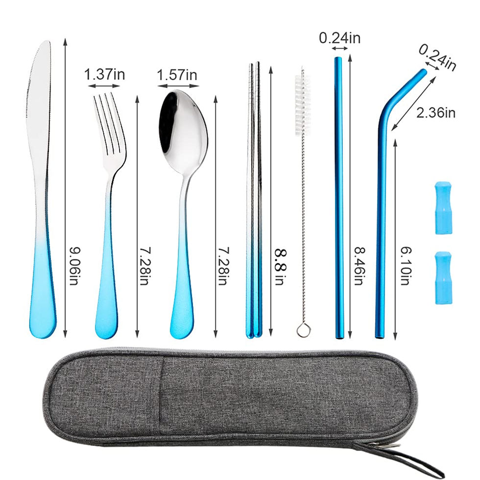 The Travel tableware set- includes travel flatware carrying case,Dinner knife,fork, spoon,chopsticks, cleaning brush, straws Safe and High quality: all of our product is made of high quality food grade stainless steel durable and healthy for daily use, dishwasher safe. Easy to carry: this carrying case can stabilize the travel utensil so that it'll make NO noise during the travel. The round designed spoon and super sturdy fork provide you a pleasant experience to use this portable flatware. Eco-friendly & Easy to Clean- Say no to throwaway or single-use plastic flatware! It is an environmentally-friendly way to use this Reusuable travel flatware with chopsticks. The waterproof lining inside the travel cutlery sets is made of aluminum foil which is easy to clean. Versatile - Stainless Steel Utensil Set for Camping, Travel, Office, College School, Car, Backpacking trip, Picnic, Hiking, Esky, Caravan, Scouts and more.Your satisfaction is our highest priority.