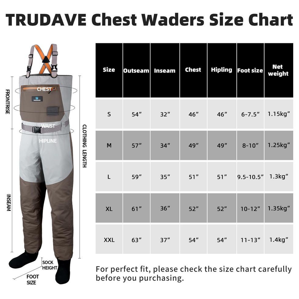 【Convenient Large Pockets】This mens waders feature a large chest storage pocket with a waterproof zipper closure, plus a flap pocket for easy access to personal items like your phone and fishing license. 【Comfortable to Wear】The design and cut of the Trudave waders allow for easy knee bending, with front leg seams enabling unrestricted movement and preventing abrasion in key inner thigh areas. Adjustable elastic suspenders for enhanced comfort and optimal fit; an adjustable wide waistband with durable quick-release buckles. 【Durable and Reliable】The ergonomically designed sock feet are made of high-density neoprene, providing durability and wear resistance for high-intensity use. 【100% Waterproof】Each pair of the waders for men waterproof undergoes rigorous testing to ensure waterproofing and maximum performance. The men's waterproof waders come with a mesh storage bag and a repair kit for easy maintenance and storage. 【Size Attention 】The lightweight waders are less restrictive than boot-style waders because they don’t come with a boot and you can choose the wader boot separately. Please pay attention to the Trudave chest waders for men size chart, the size of these chest waders stockingfoot will be slightly larger,you can choose the appropriate size according to the actual situation.