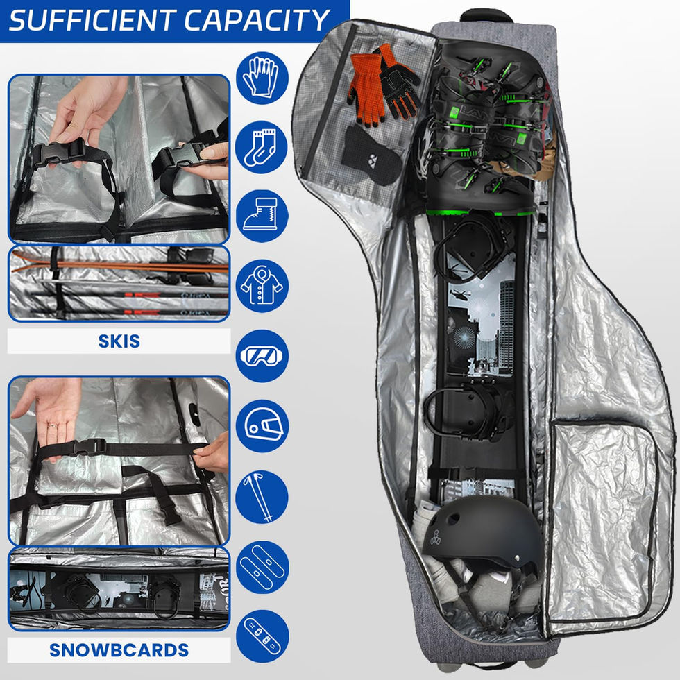 GREAT SIZE TO FIT MOST SKI EQUIPMENT: The size of this double roller travel ski/snowboard bag is 204.2 x 25 x 33cm which can accommodate skis/snowboards up to 190cm. And the padding rolling ski/snowboard bag has a two-strap bundling system that flexibly adjusts to ensure storage of single or double skis, or two sets of skis. PREMIUM DURABLE MATERIAL: The double wheeled ski bag is made of 1200D waterproof polyester fabric, which is great for protecting your snowboard or ski gear from all weather conditions. There are 5mm eva isolation pads between the skis to prevent collisions between the skis. HIGH STORAGE CAPACITY: The wheeled padded ski bag with two compartments and a mesh pocket to keep your ski gear in different sections. Central ski storage area with ski pole straps on both sides. Also includes an extra waterproof dry bag with a removable shoulder strap. You can take it out and use it on its own or hang it in the snowboard/ski storage area to isolate your snowboards/skis and provide crash protection. HEAVY DUTY SMOOTH WHEELS: High quality smooth wheels make this rolling ski/snowboard bag easy to maneuver in the airport. The combination of a bottom PE support plate and two external PP reinforcement bars further enhances robustness. In addition, this snowboard/ski bag for air travel has reinforced support plate on the bottom, so after closing up, it will retains nice square shape, instead of bending. ERGONOMIC CARRYING DESIGN: The padded snowboard/ski bag has 3 pcs handle, a detachable adjustable shoulder strap, a backpack shoulder straps (packaway pocket to stow when not in use or checked baggage for a flight). This double ski/snowboard bag equipped with handles in all directions, padded carrying handles and removable shoulder straps for comfortable carrying options.