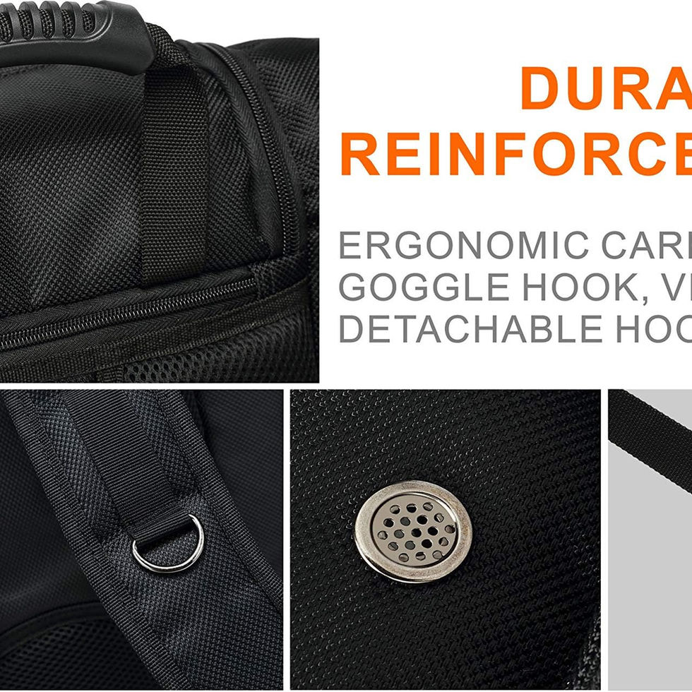 GREAT CAPACITY FOR WINTER SPORTS - This boot bag holds ANY SIZE boots, helmet, jacket, clothing, goggles, gloves and other stuff. Bring additional gear using the outer compartments for outdoor skiing, snowboarding, skating, and so on. PROFESSIONAL DESIGNED PADDED BACKPACK - This boot bag includes padded backpack HIDDEN adjustable straps, three padded lumbar back pads for comfortable, hands-free carrying. The straps can be hidden for transportation and travel. 1680D POLYESTER, DOUBLE PU COATED & ANTI-SLIP PVC - Waterproof and wear-resistant, durable for any weather conditions, especially in Snow. HIGH QUALITY DETAILS - Non-Slip Waterproof Bottom makes the bag stable on slippery and wet surfaces. There is Drainage Holes in the bottom of the bag helping melted ice out of the bag. The bag provides Ventilated Holes in side-entry boot pockets circulate air preventing smell, dry the boots without getting molded. SMOOTH ZIPPER, STERNUM STRAP & ERGONOMIC CARRYING HANDLES- SBS zippers make open and close bag smoothly. Sternum strap and ergonomic carrying handles help carrying ski equipment comfortably.