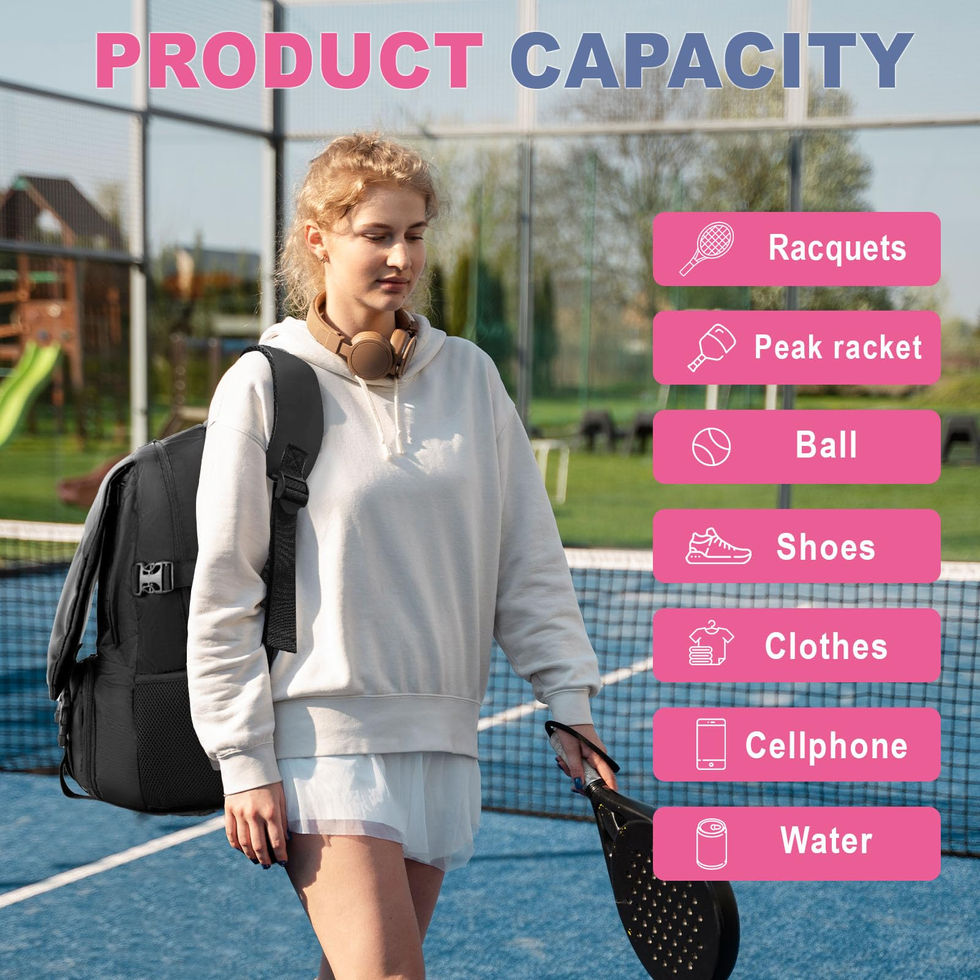 【Large Tennis Bag】With measure: 12.6''×9.1''×17.9''.The tennis backpack Safely store up to 2 rackets in the padded compartment, while the main compartment offers ample space for accessories and a separate section keeps wet items isolated 【Insulated Pocket 】The front pocket of this tennis bag is insulated with foam and features an aluminum layer,effectively maintaining the temperature of cold drinks and preserving food freshness for hours 【Separate Shoe Compartment】:Say goodbye to odor buildup with our tennis racket bag’s ventilated shoe compartment, ensuring freshness and cleanliness throughout your tennis journey 【User-Friendly Features】As a convenient tennis bag with a padded racket-shaped divider for secure racket storage, double anti-slip zippers for added security, and a practical fence hook for easy access during matches 【Premium Quality Craftsmanship】This tennis racquet backpack is made of waterproof polyester material with sturdy stitching. our tennis bag offers adjustable padded shoulder straps for comfortable carrying, making it the perfect companion for all your sporting adventures and travels