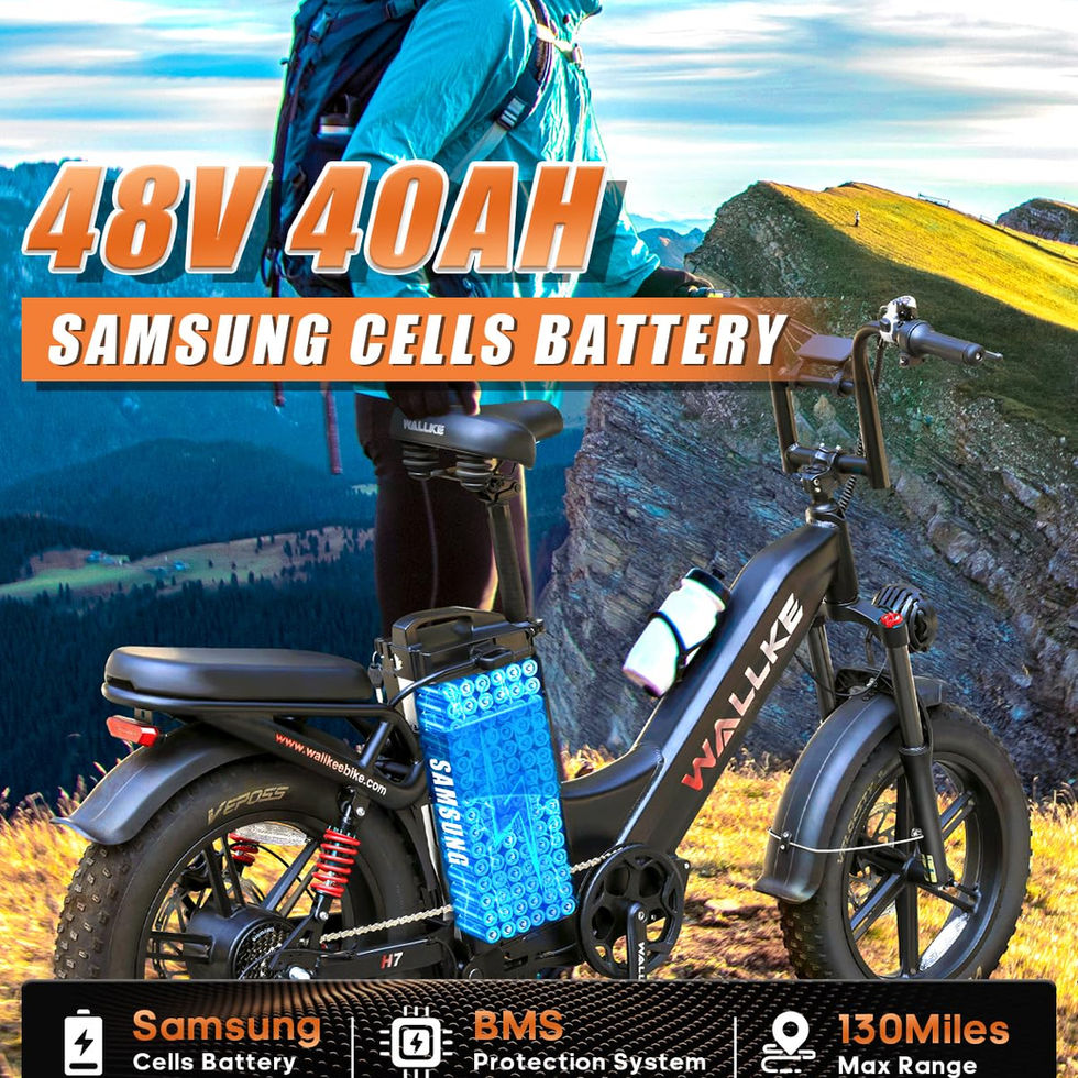 ใ๐๐๐๐๐ ๐๐๐๐ค ๐๐ซ๐ฎ๐ฌ๐ก๐ฅ๐๐ฌ๐ฌ ๐๐จ๐ญ๐จ๐ซ & ๐๐๐๐๐ ๐๐๐ ๐๐ฉ๐๐๐ใPowered by 1200W brushless motor, the H7 electric bike achieves a peak power of 2000W. it swiftly reaches top speeds of 31MPH. Boasting 105 Nยทm of torque, conquers max slopes 40ยฐ. 48V 30A controllers deliver smooth power and stable performance on any terrain, making it an ideal choice for thrill-seekers and daily commuters alike ใ๐๐จ๐ง๐ -๐๐๐ง๐ ๐ ๐๐๐ ๐๐๐๐ก ๐๐๐ฆ๐ฌ๐ฎ๐ง๐ ๐๐๐ฅ๐ฅ ๐๐๐ญ๐ญ๐๐ซ๐ฒใH7 Electric Bike for Adults features a 48V 40Ah Samsung lithium-ion battery, maximum range: 130 miles, but it may vary depending on load, road conditions, and speed, allowing you to go anywhere you want. The waterproof, removable battery features a built-in lock for quick detachment and secure charging, ensuring protection from theft and the elements. ใ๐ ๐ฎ๐ฅ๐ฅ ๐๐ฎ๐ฌ๐ฉ๐๐ง๐ฌ๐ข๐จ๐ง ๐๐ฒ๐ฌ๐ญ๐๐ฆใ:Featuring 4-piston 203mm hydraulic disc brakes, this e-bike offers superior stopping power, ensuring safety and control at high speeds. Paired with a lockable hydraulic suspension and an aluminum rear shock absorber, itโs built to absorb shocks and smooth out bumps, providing a more comfortable ride. ใ๐๐ ๐๐ง๐๐ก ๐๐ฅ๐ฅ ๐๐๐ซ๐ซ๐๐ข๐ง ๐ ๐๐ญ ๐๐ข๐ซ๐ & ๐๐ญ๐ฎ๐ซ๐๐ฒ ๐๐ฅ๐ฎ๐ฆ๐ข๐ง๐ฎ๐ฆ ๐ ๐ซ๐๐ฆ๐ใH7 ebike latest upgraded to a certain level of puncture-resistant 20"x 4" fat tires and a professional SHIM 7-speed transmission system, making it easy to conquer challenging terrains. The sturdy aluminum frame ensures a safe ride for up to 400lb riders. A well-built rear rack with excellent load capacity effortlessly supports your cargo and groceries. ใ4 ๐๐ข๐๐ข๐ง๐ ๐๐จ๐๐๐ฌ & ๐๐ฉ๐ฉ ๐๐จ๐ง๐ญ๐ซ๐จ๐ฅใ:W Wallke Electric bike for adults offers 4 different riding modes,To customize your ride according to your preferences and conditions:Switch between Throttle, Pedal Assist, Walking Modes, and Single Drive Modes to effortlessly switch between long-distance travel and exercise.This electric bike features a full-color screen with USB port that lets you monitor key information such as battery level, distance traveled, speed,and riding mode
