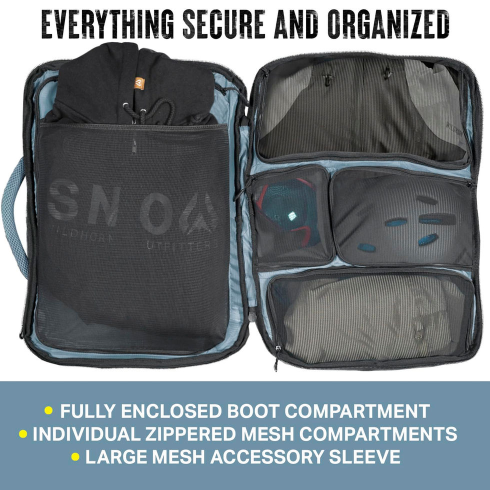 GEARED UP TO SHRED: Easily store everything you'll need for an epic day on the mountain. Give your gloves, goggles, helmet, and especially your boots a place to call home with the Wildhorn Brimhall Ski Boot Bag backpack. Fully packed the bag measures 14 in x 13 x 19. "PERFORMANCE MATERIALS: Our premium ski travel bag offers performance materials, durable zippers and hardware. Made of 420d nylon water-resistant outer shell & base the Brimhall can handle a snow day. Our inner liner is made of water-resistant 210d poly to keep it dry when storing your snow gear after a long day in powder. We also added padding to the back of the bag to offer extra comfort when carrying as a ski boot backpack. " 3 CARRY OPTIONS: Backpack Straps - Stow-away fully adjustable backpack straps with sternum strap. When not in use, simply tuck and zip them away into their own compartment. Shoulder Strap - Prefer a more traditional duffel carry style? The Brimhall features a durable removable shoulder strap with a fully adjustable, foam lined shoulder pad. Handles - Keep your snowboard backpack strap free and utilize either of the two heavy duty luggage style easy access handles. SKI BOOT STORAGE: The isolated ski bags for the compartment feature vented ports that drain water and provide airflow to get rid of any after-skiing smell and keeps all your snowboard accessories safe. The compartment fits boots up to size 32 and features a removable boot separator to make sure they fit snug in the bag. "POCKET ESSENTIALS - The Brimhall offers 5 internal storage pockets and 1 outside pocket for easy access travel needs. Our second compart offers a plush lined goggle pocket to prevent scratching when traveling. The 4 other pockets create divided storage for your ski helmet, socks, ski gloves and any other snow gear or ski apparel, doing of It one of the best ski gear storage bags, ski bags and boot bags. "