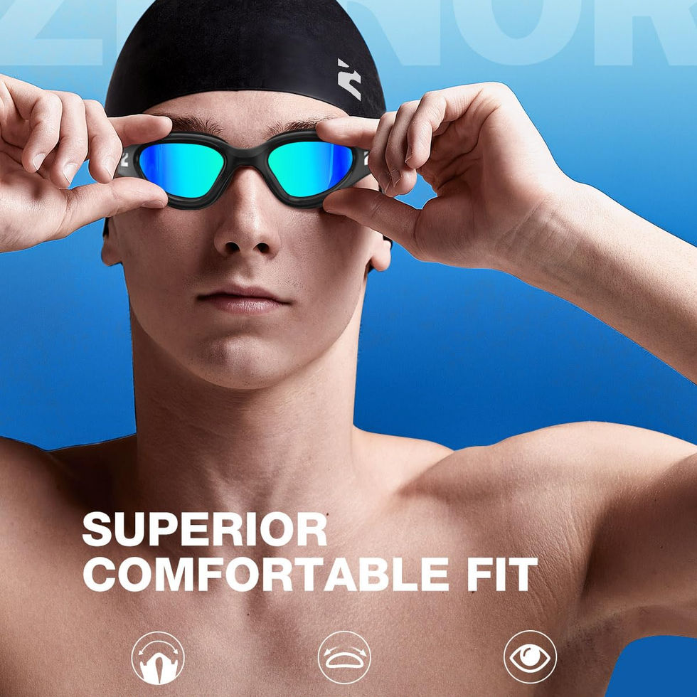 Complete Swimming Gear Set: Includes one pair of swim goggles, a silicone swim cap, and a storage bag all in one. The soft and breathable mesh bag allows you to easily store the goggles and cap before or after swimming, without worrying about residual water not evaporating from the goggles. Convenient for carrying around and using on the go. Fog-Free & UV Protection: ZIONOR adult swim goggles feature advanced anti-fog technology to ensure a clear underwater vision during swimming. The UV protective coating on the lenses effectively shields against harmful UVA and UVB rays, restoring true colors, eliminating glare and scattered light, making them ideal for indoor and outdoor training. Excellent Leakproof Performance: Designed with an ergonomic outer eye socket that fits both men's and women's faces. These goggles come with soft silicone gaskets that adhere snugly to the outer eye sockets. The 3D dual-seal frame provides exceptional comfort and leak-proof performance. Adjustable split head straps and flexible TPR nose bridges provide a comfortable fit. Clear Panoramic View: Equipped with curved, high-definition lenses, the anti-fog goggles offer a wider peripheral vision. The 180° viewing angle ensures that you maintain visibility in crowded pools or open waters, keeping you safe at all times. 100% Silicone Swim Cap: This swim cap is crafted from premium silicone material, lightweight and highly elastic. The inner anti-slip texture provide a firmer grip, preventing water entry and keeping your hair dry.